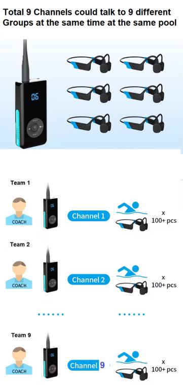 Ability to have multiple groups on selective channels. The trainer can switch channels to communicate to specific groups with a touch of a button.